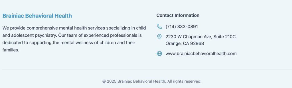 Don’t let concerns about your child’s mental health go unaddressed. Contact Brainiac Behavioral Health today at (714) 333-0891 to schedule a consultation. Our compassionate team is ready to help your child thrive. Visit us online at www.brainiacbehavioralhealth.com to learn more about our services and how we can support your family’s mental health journey.